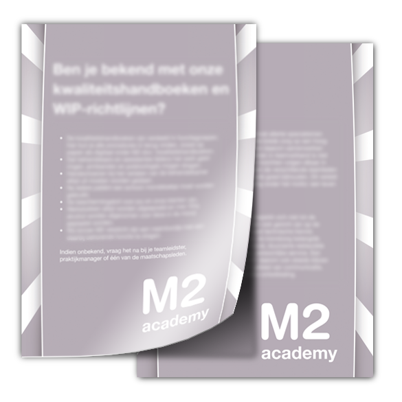 M2 tandartsen is in Zuid-Holland een grote naam in de tandheelkunde branche. Met een slimme nieuwe werkwijze kun je als ‘patiĆ«nt’ bij hen tussen 07:00 ’s ochtends en 21:00 ’s avonds terecht. Een slimme zet en blijkt bij de doelgroep erg aan te slaan. Met vestigingen in Voorburg en Oegstgeest is het uiteraard van belang dat alle personeelsleden dezelfde handleiding aan houden. M2 tandartsen heeft StudioGM2 gevraagd hier materiaal voor te maken.